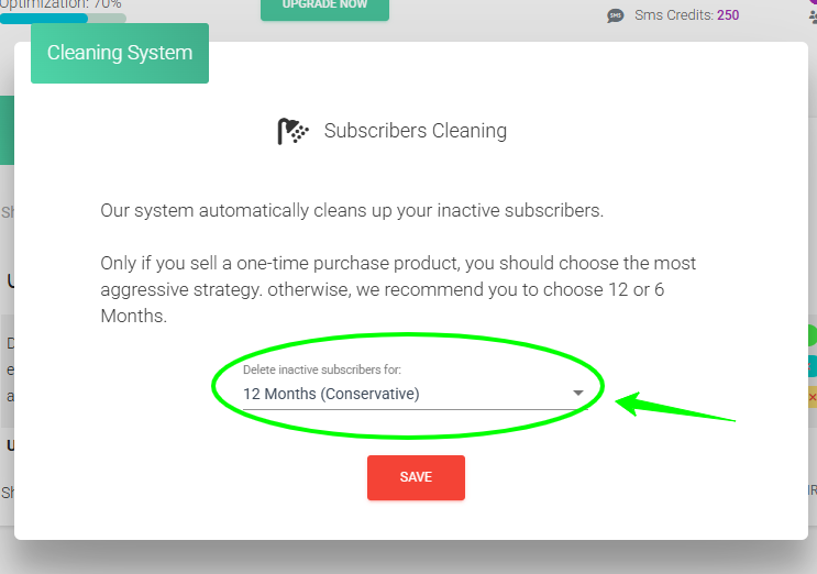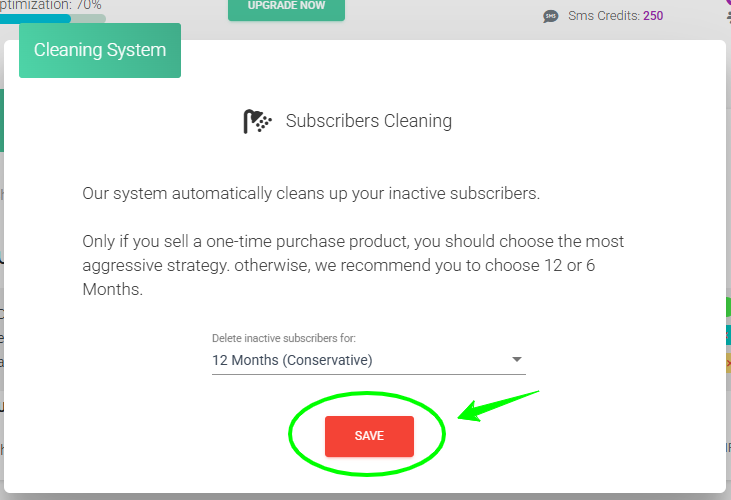 - AIt will look like a window where you can choose the inactivity period for subscribers to delete them: 12 months (conservative), 6 months (moderate), and 3 months (aggressive). Select the one that suits you.