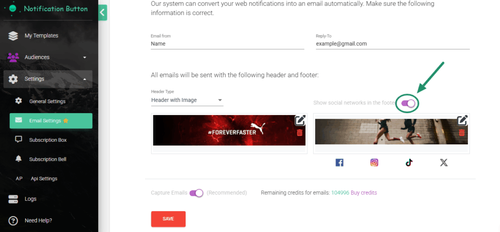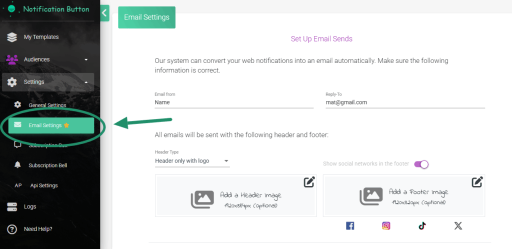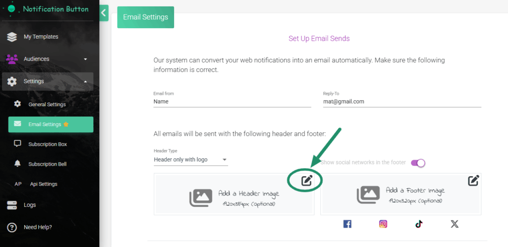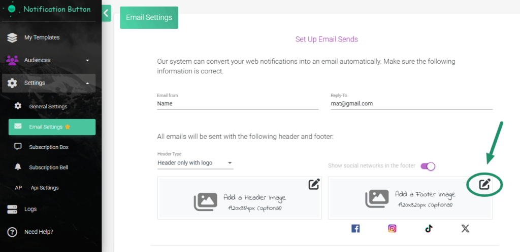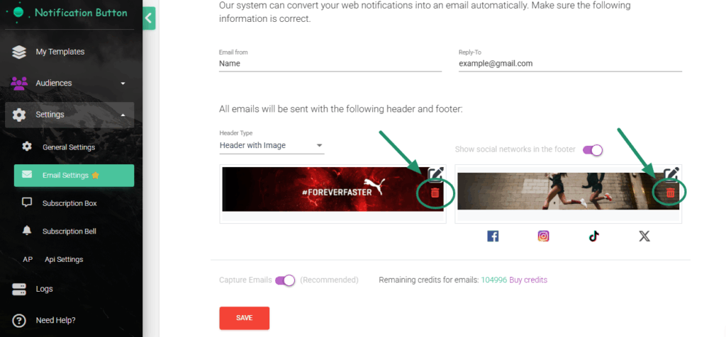 If you need to update your header or footer, return to the email settings section. There you’ll find your images already configured along with a delete button. Just click it to delete the image, and then you can configure a new image.