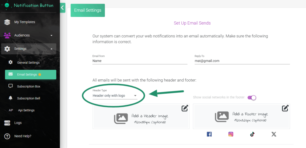 - To configure the header, click “Header Type” and select whether you want only the logo or an image.